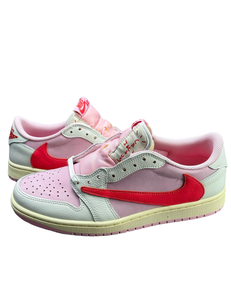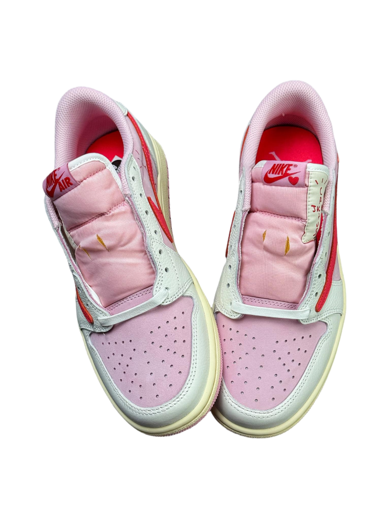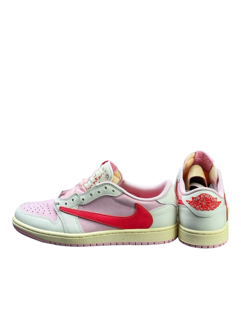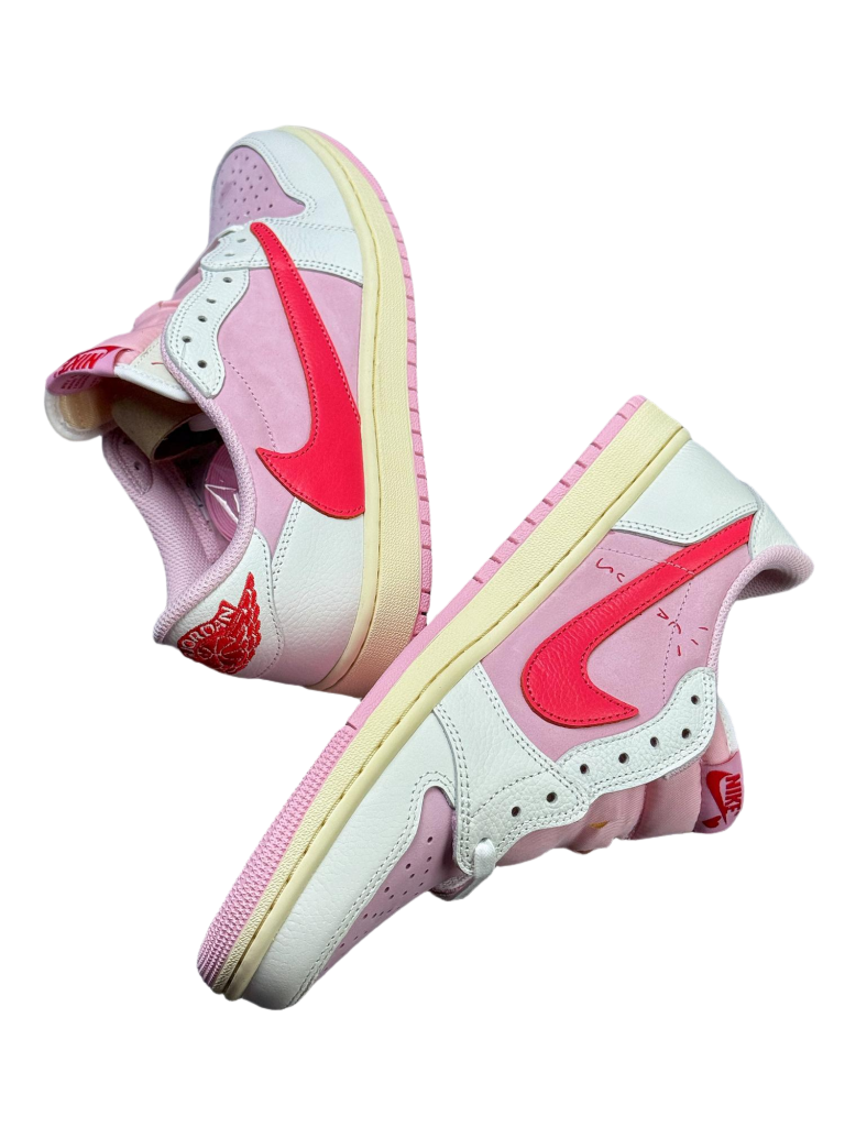 La Travis Scott x Air Jordan 1 Low OG Tropical Pink destaca por su estética exclusiva y el diseño característico de la colaboración con Travis Scott.