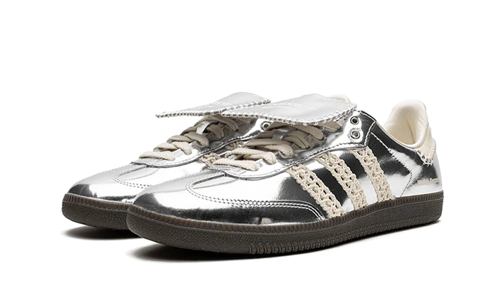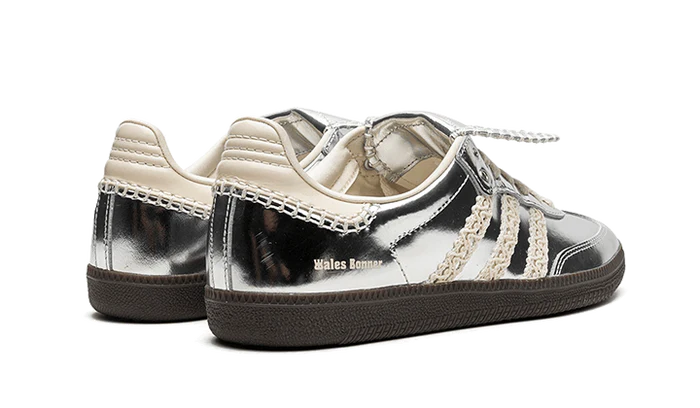 Con un lanzamiento muy esperado en 2023, Wales Bonner y Adidas vuelven a unir fuerzas. El co-branding se luce en el lateral con un tono crema que se integra perfectamente al diseño. La versión ‘Silver’ reinventa el estilo Samba con un acabado en cuero plateado brillante y 3-Stripes de estilo tejido para un toque único. La suela de goma marrón oscuro crea un contraste llamativo, mientras que los tonos beige en el talón y los cordones mantienen la esencia de la paleta característica de Wales Bonner.